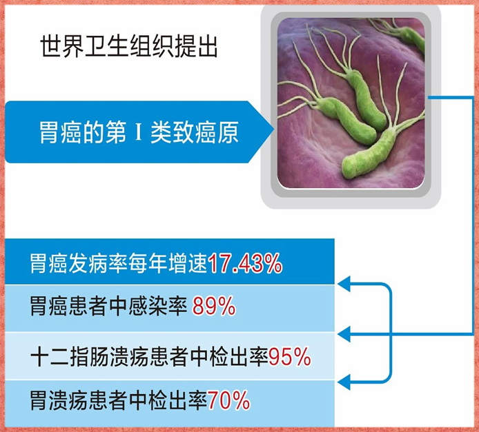 幽门螺旋杆菌(Helicobacter Pylori)是一种寄生于人体胃粘膜的革兰氏阴性螺杆菌。于1983年被Warren和Marshall发现。它能够在高度的胃酸中生存,不但可以包裹胃粘模,还可以穿过胃的保护屏障,引起胃部病变。目前研究表明,一般正常胃黏膜感染幽门螺杆菌以后,会出现慢性浅表性胃炎。如果持续存在幽门螺杆菌感染,会出现慢性萎缩性胃炎。如果感染不治疗,可能会出现肠化生、细胞异形增生,最后发展成胃癌,所以幽门螺杆菌的感染危害非常大。
